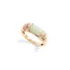 Set with a polished jade panel, the ribbed shoulders each set with two eight-cut diamonds, plain band, stamped 14k