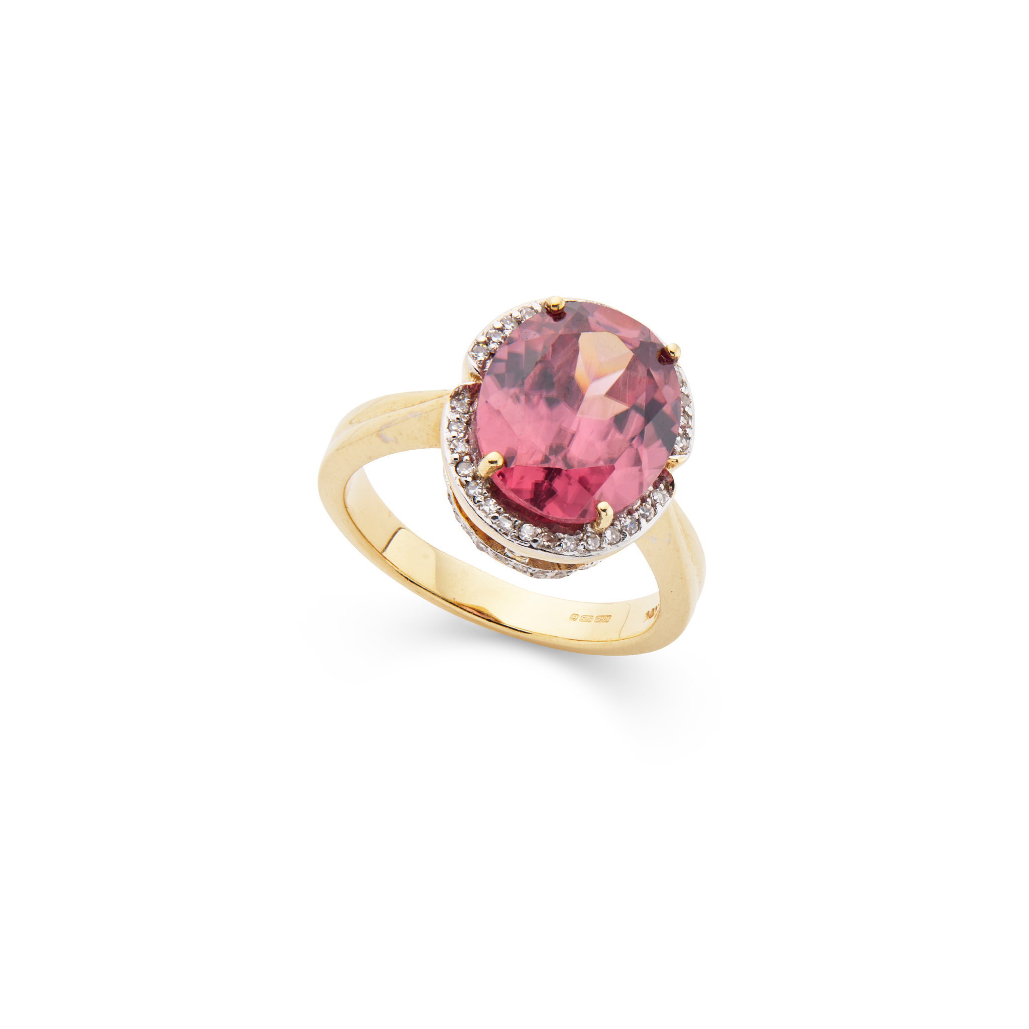 Claw-set with an oval-cut pink zircon, in a border of eight-cut diamonds, the gallery similarly set, plain band, UK hallmark