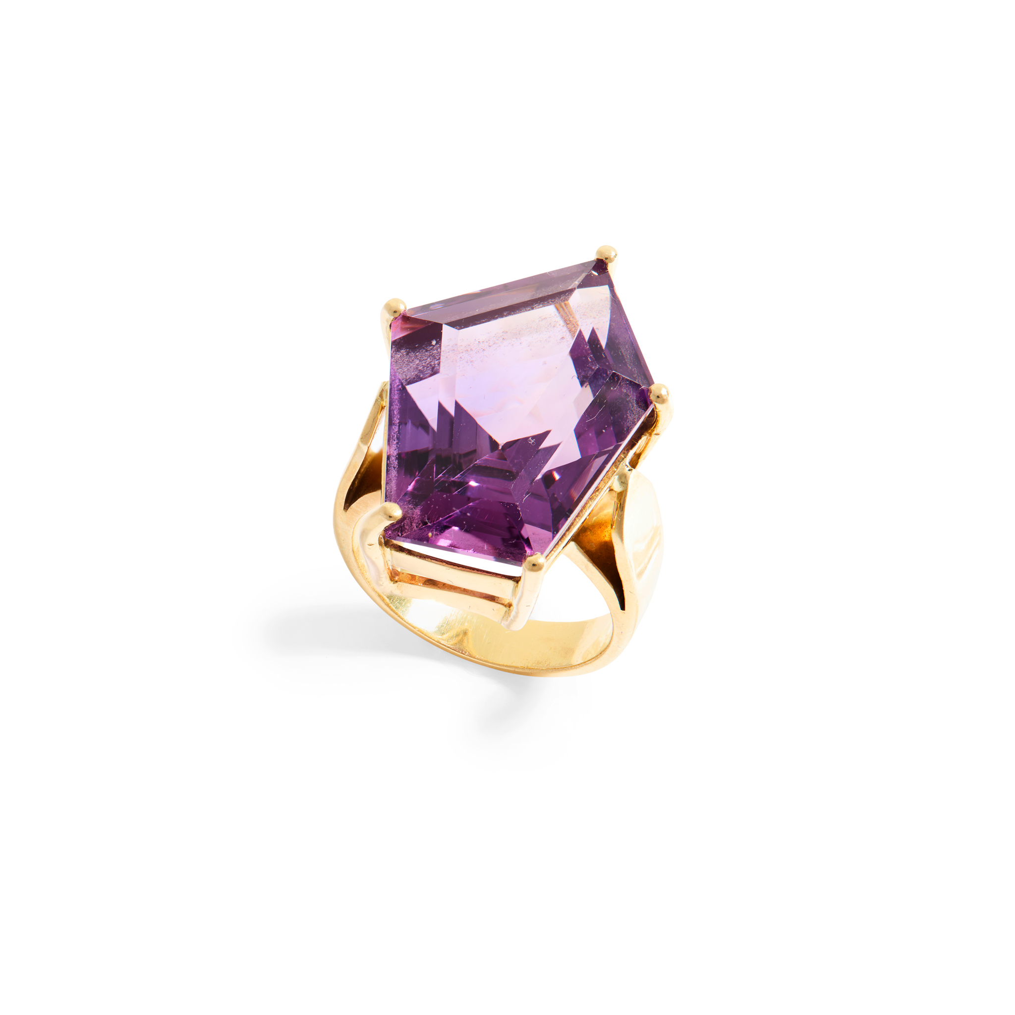 Claw-set with a large pentagonal step-cut amethyst, plain band, stamped 750