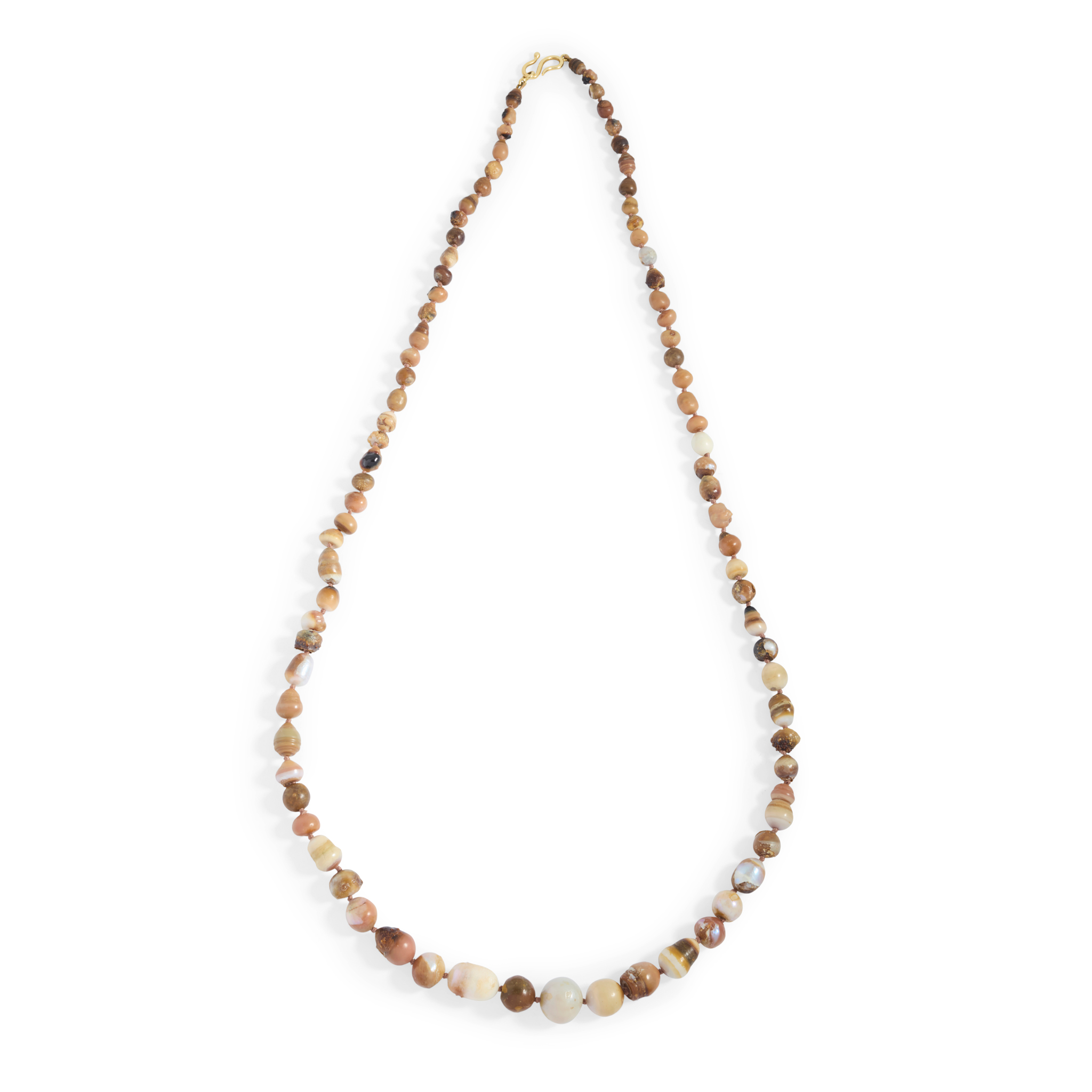 Composed of a single strand of graduated Scottish freshwater pearls, ranging from brown to brownish cream, hook clasp, unmarked