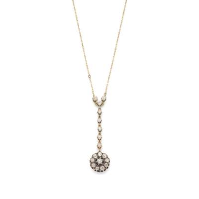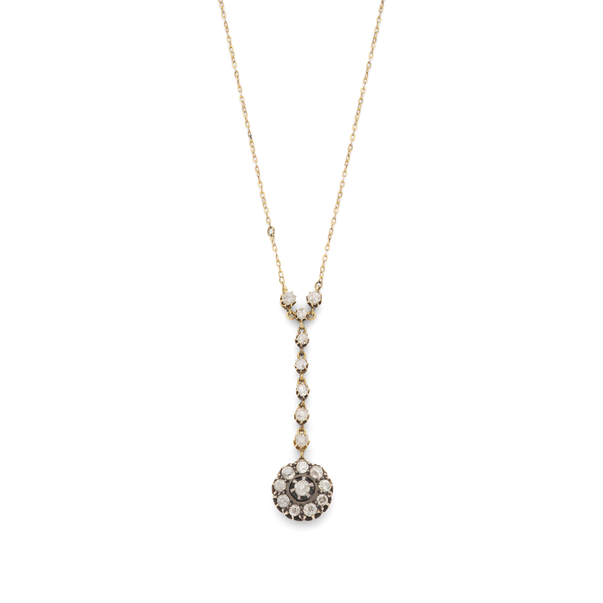 Modelled as an old round-cut diamond cluster, suspended from diamond links, integral trace-link chain, unmarked