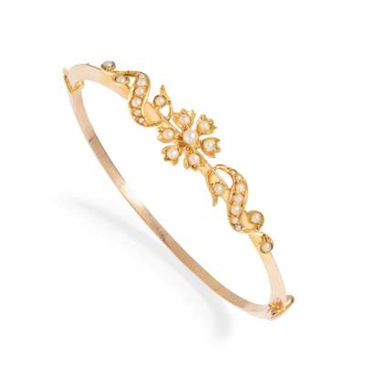 Of hinged design, the front half with scrolling floral detail set with seed pearls, stamped 15; in a fitted box for Hall & Co … Manchester