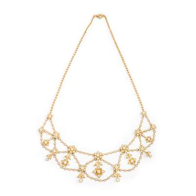 Designed as a floral swag, set throughout with graduated seed and bouton pearls, unmarked; in a fitted box for Hall Co … Manchester