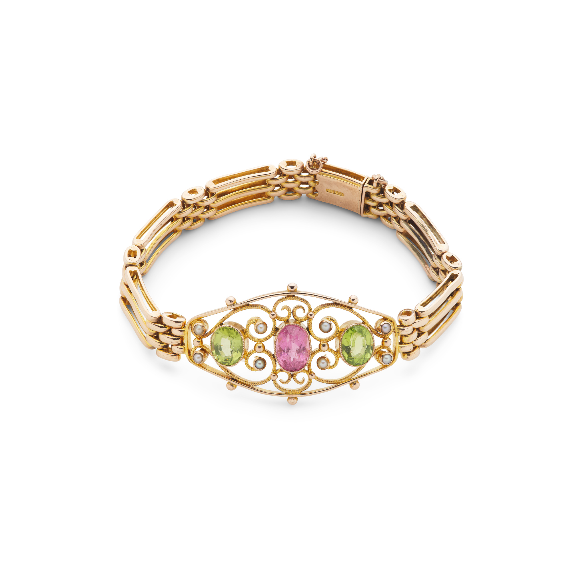 Millegrain-set with a central oval-cut pink topaz and two oval-cut peridots, in a pierced scrolling surround set at intervals with seed pearls, to a gate-link bracelet, stamped 9c