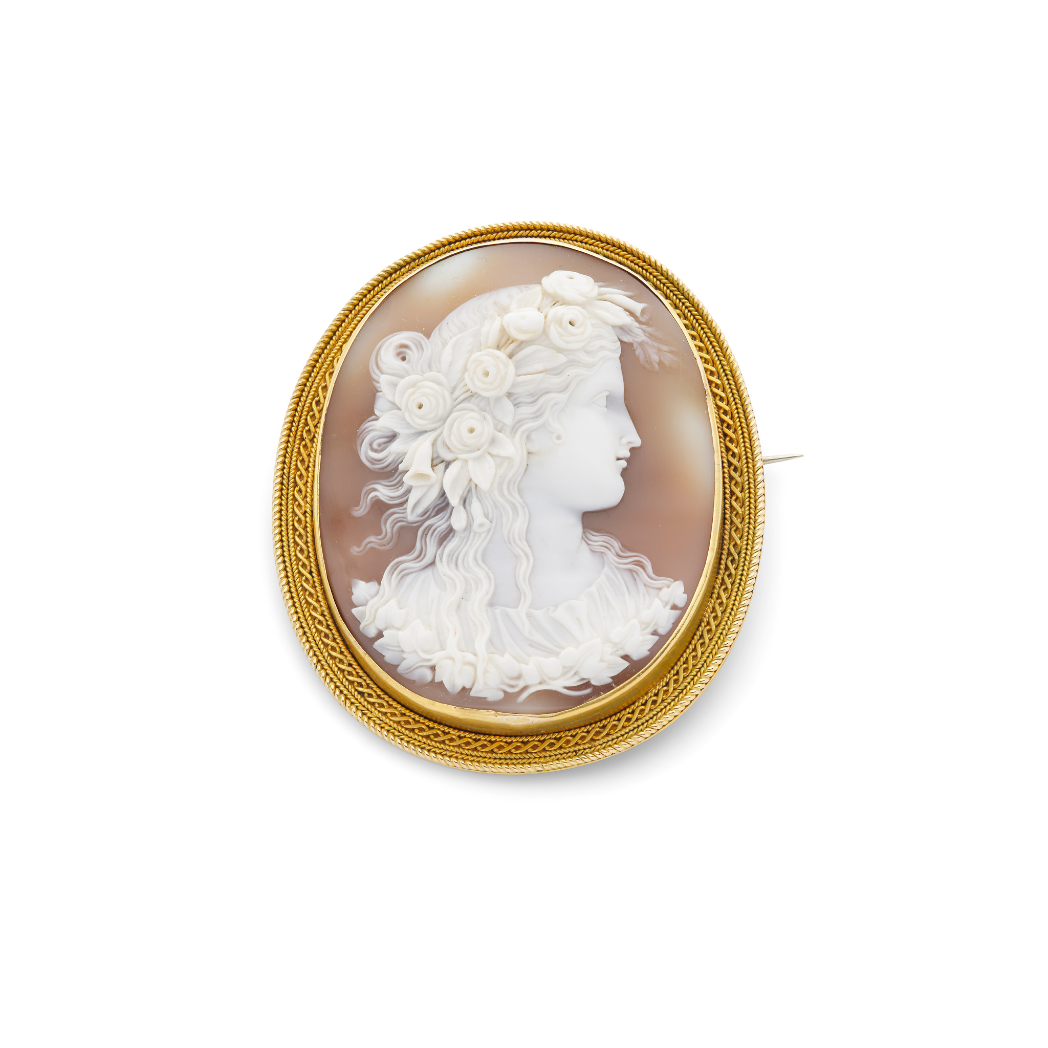 The shell cameo depicting a woman in profile wearing a floral garland, the border with rope-twist detail, unmarked