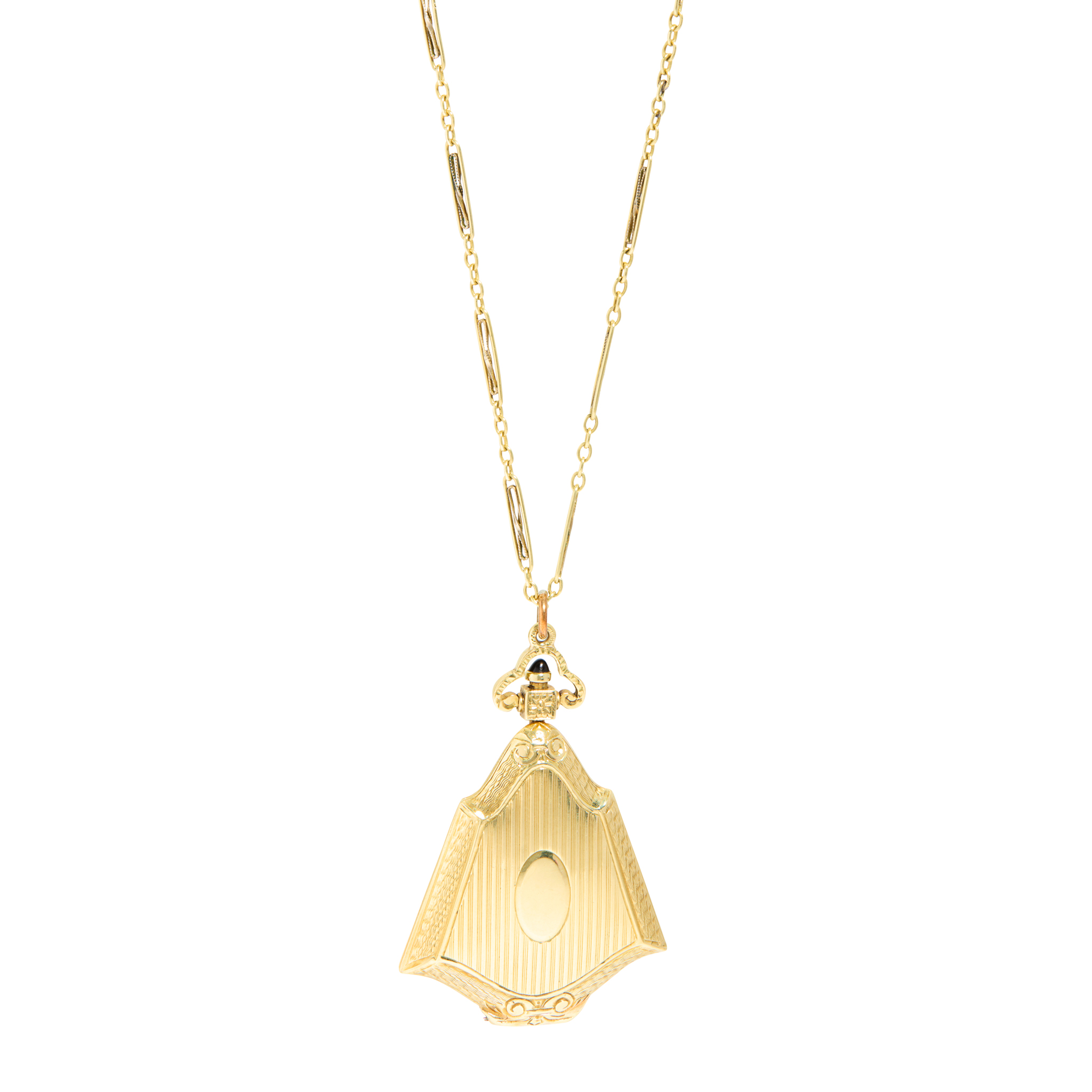 The locket of shaped tapering outline with engine turned detail, glazed panels to interior, cabochon onyx detail to terminal, to a fancy-link chain (broken), both unmarked