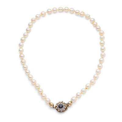 Composed of a single strand of cultured pearls, the clasp claw-set with a cushion-cut sapphire in a double border of round brilliant-cut diamonds, unmarked