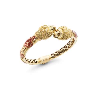Of sprung hinged design, each terminal modelled as a lion's head, pierced detail with red enamel detail, stamped K18