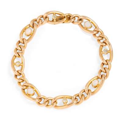 The curb-link bracelet set at intervals with cabochon opals and old round-cut diamonds, stamped 15