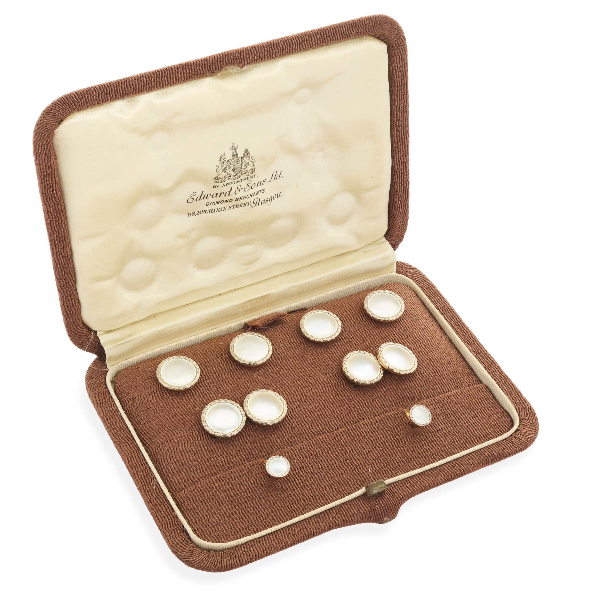 Comprising four buttons, a pair of cufflinks and two collar-studs, each circular terminal set with a mother of pearl panel, joining belcher links, stamped 18ct 9ct; in a fitted case for Edward & Sons … Glasgow