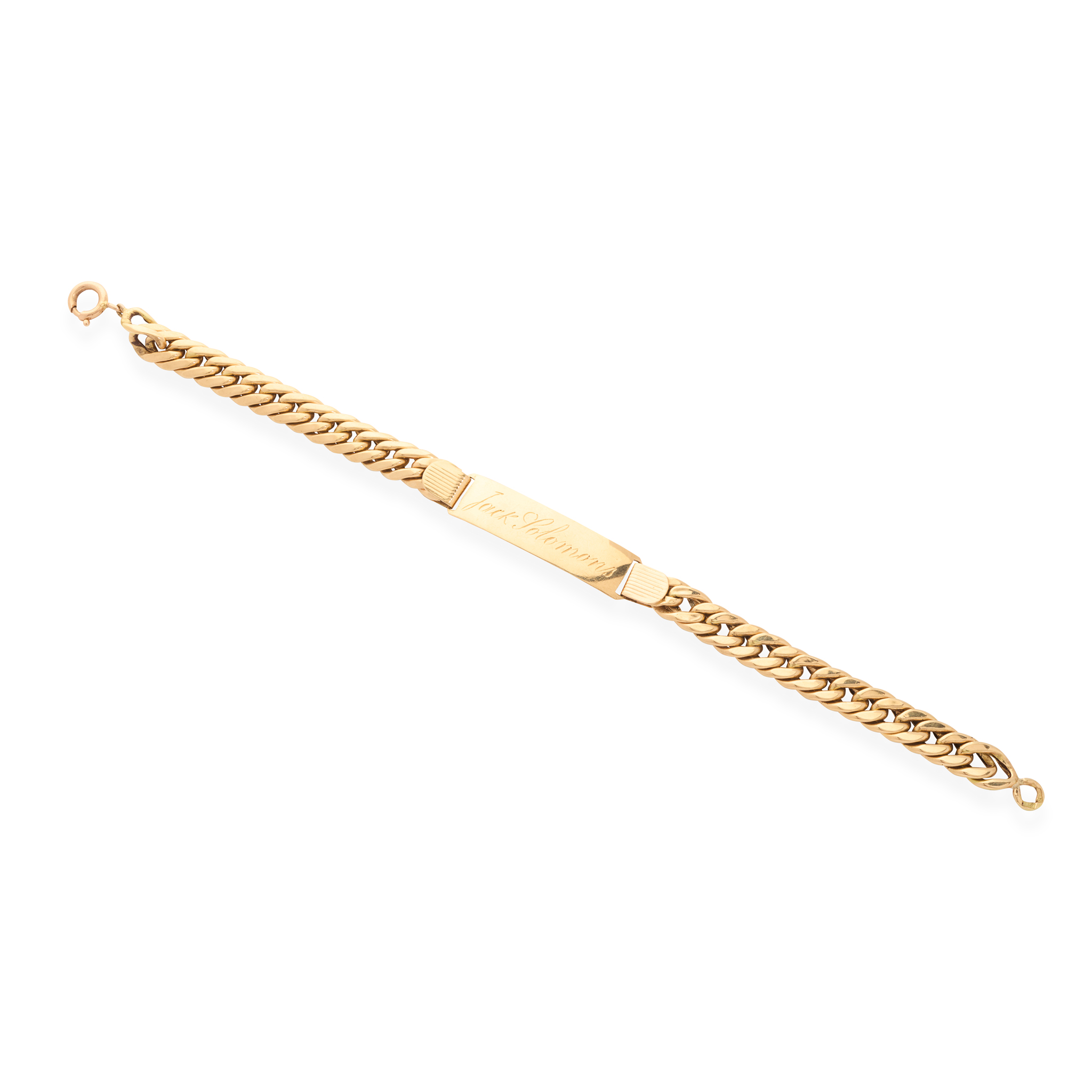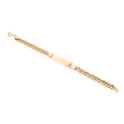 Composed of flattened curb-links, the central panel engraved ‘Jack Solomons / London’, stamped 750 18ct