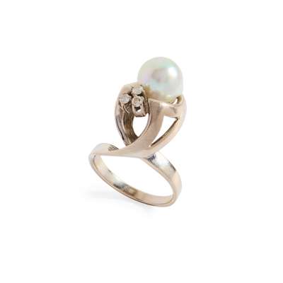 Of scrolling design, set with a single cultured pearl and three small round brilliant-cut diamonds, plain band, stamped 585