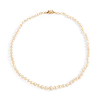 Composed of a single strand of slightly graduated cultured pearls, the clasp set with a single cultured pearl in a border of rose-cut diamonds, unmarked