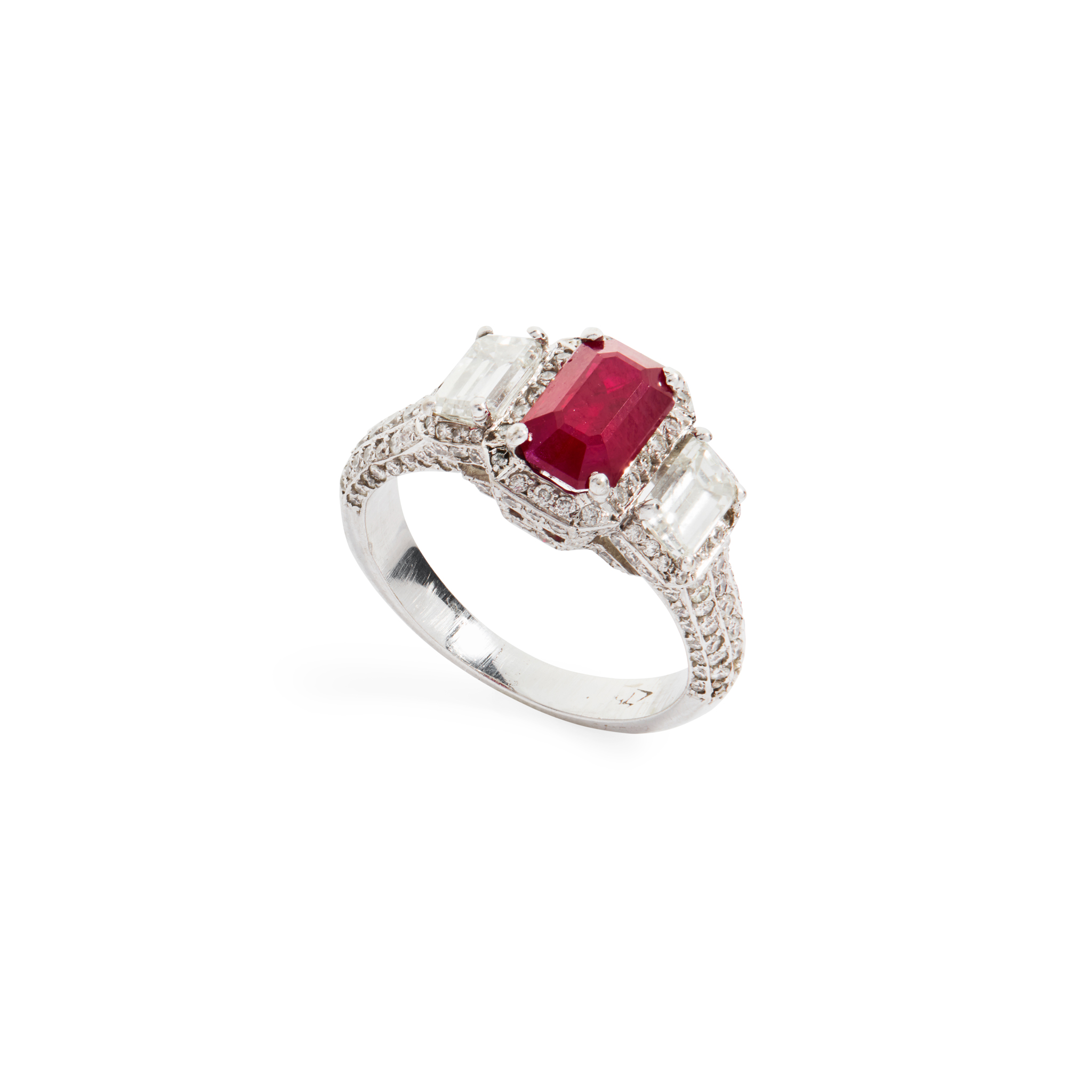 Claw-set with a rectangular step-cut ruby and two diamonds, each in a border of round brilliant-cut diamonds, shoulders and gallery are similarly set, plain band, indistinctly marked