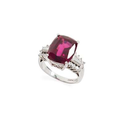 Claw-set with an oval cushion-cut garnet, each shoulder set with a tapered baguette-cut diamond in a border of smaller round brilliant-cut diamonds, plain band, stamped Pt900