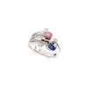 Claw-set with an oval-cut blue and pink sapphire, the spray shoulders set with graduated round brilliant-cut diamonds, plain band, indistinctly marked