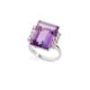 Claw-set with a rectangular step-cut amethyst, each shoulder claw-set with four round brilliant-cut diamonds, plain band, UK hallmark