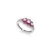 Millegrain-set with three graduated round brilliant-cut diamonds, in a geometric surround of calibré-cut rubies and round brilliant-cut diamonds, plain band, unmarked