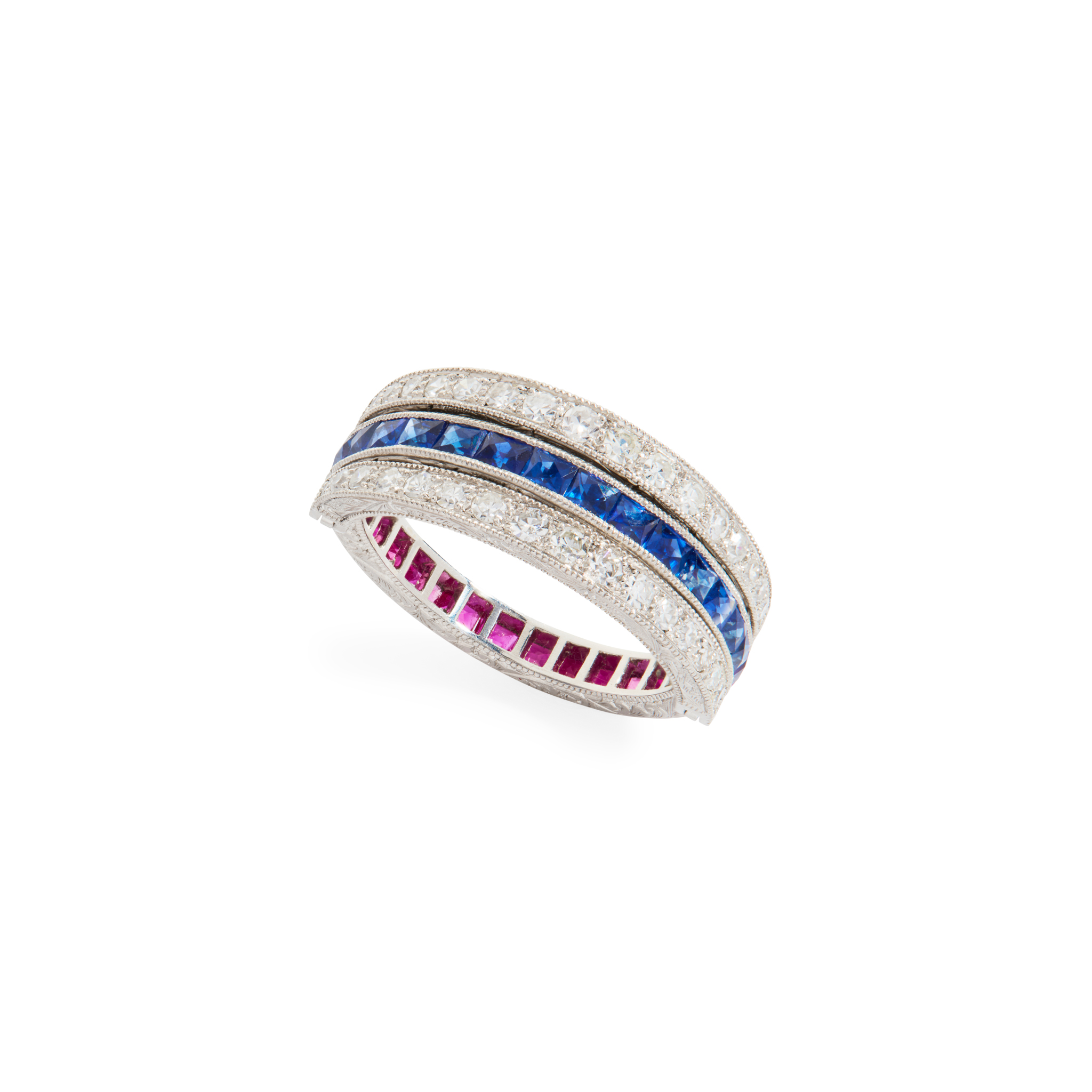 Channel-set with a row of French-cut rubies and sapphires, the two hinged bands set with graduated eight-cut diamonds, engraved details to sides, stamped PLAT