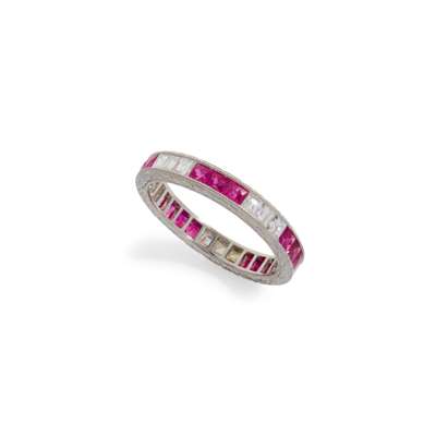 Channel-set with alternating trios of square step-cut diamonds and French-cut rubies, engraved detail to sides, unmarked