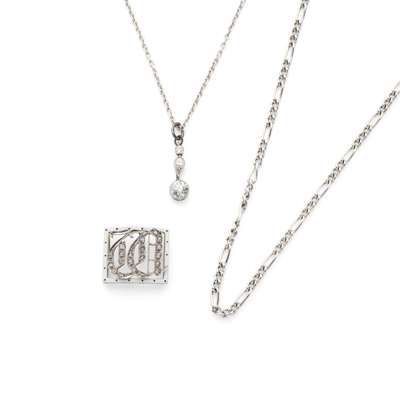 Millegrain-set with an old round-cut diamond, suspended from a diamond set bale, to a trace-link chain stamped 925; together with a fetter-link chain, stamped 925; and a rose-cut diamond and enamel ‘M’ initial pendant (3)