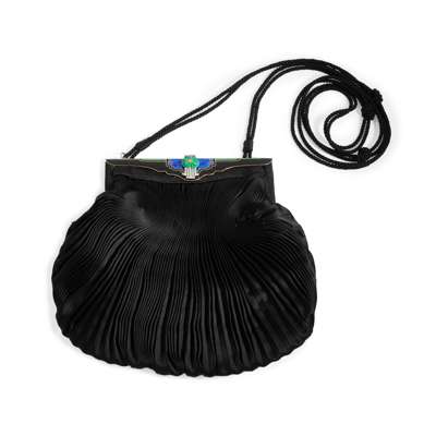 The pleated satin bag to a geometric blue, green, black and gold enamel clasp, stamped 18k; suspended from a cord clasp