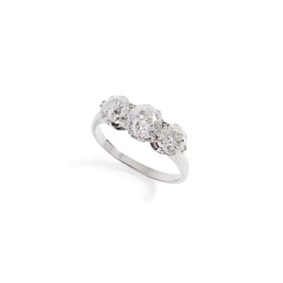 Claw-set with three graduated old round-cut diamonds, weighing a total of 2.69cts, plain band, unmarked