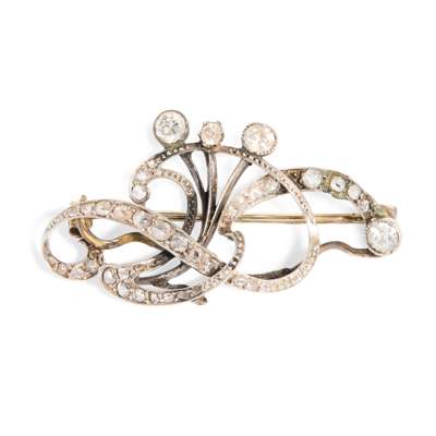 Of stylised scrolling design, set throughout with old round and rose-cut diamonds, unmarked