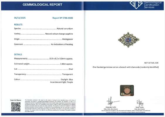 With accompanying GCS report, dated 06.11.2025, numbered 5786-0389, stating that the colour-change sapphire is natural, of Madagascan origin, showing no signs of heat treatment.