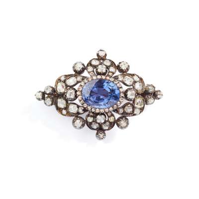 Set with an oval-cut colour-change sapphire, weighing approximately 3.80cts, in a border of rose-cut diamonds, the scrolling surround set with graduated old round and cushion-cut diamonds, unmarked