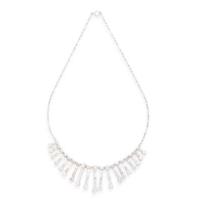 The centre front modelled as a tapering fringe, channel-set with graduated baguette-cut diamonds, and claw-set round brilliant-cut diamonds, trace-link chain, unmarked