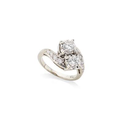 Illusion-set with two round brilliant-cut diamonds, weighing approximately 0.35cts each, the scrolling shoulders each set with four graduated round brilliant-cut diamonds, plain band, indistinctly marked