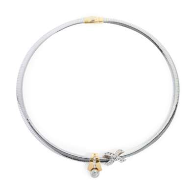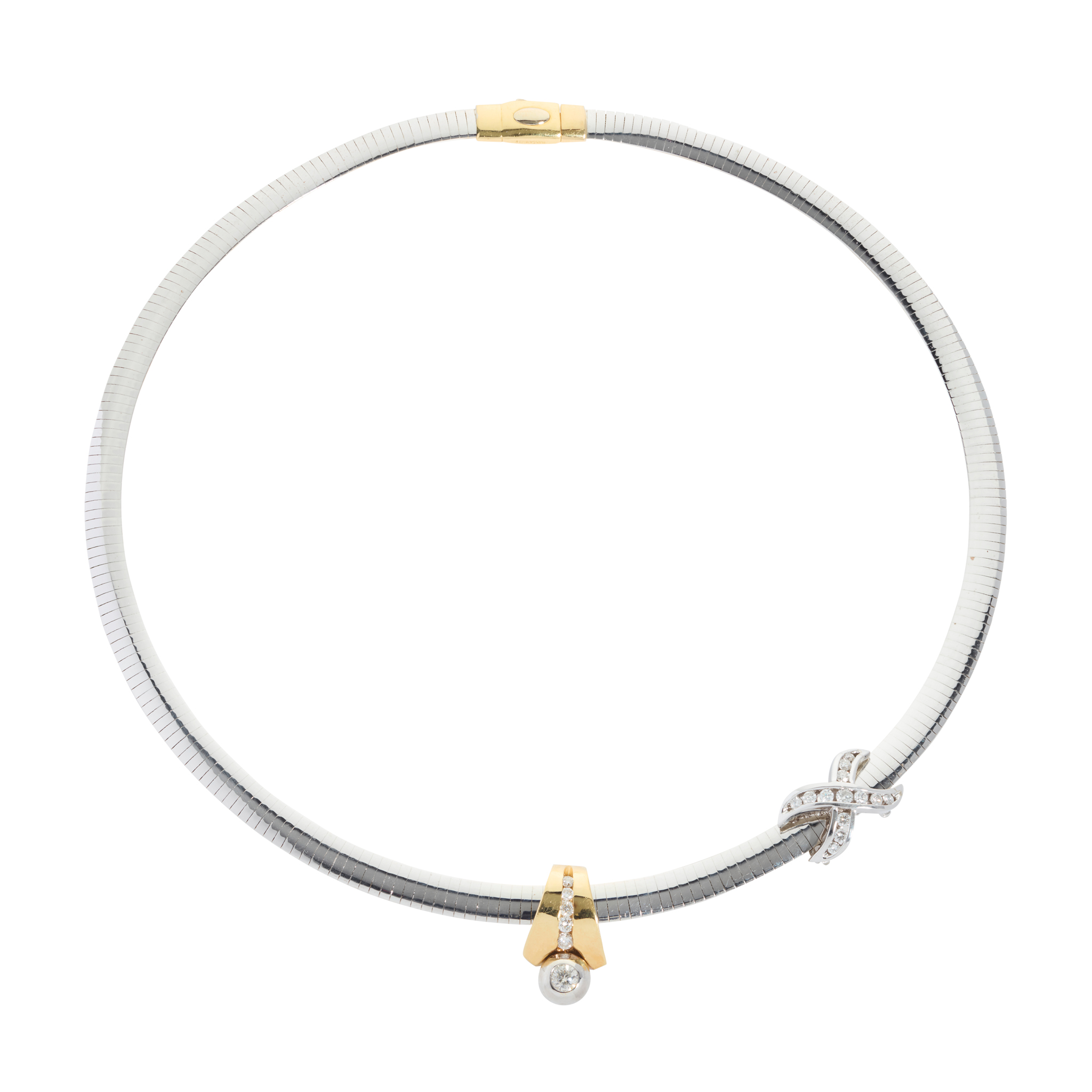 The polished omega chain set with two inter-changeable diamond pendants, the fist modelled as an ‘X’ channel-set with graduated round brilliant-cut diamonds, the other collet-set with a round brilliant-cut diamond, below a channel-set diamond bale, chain stamped 14k