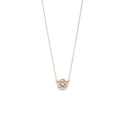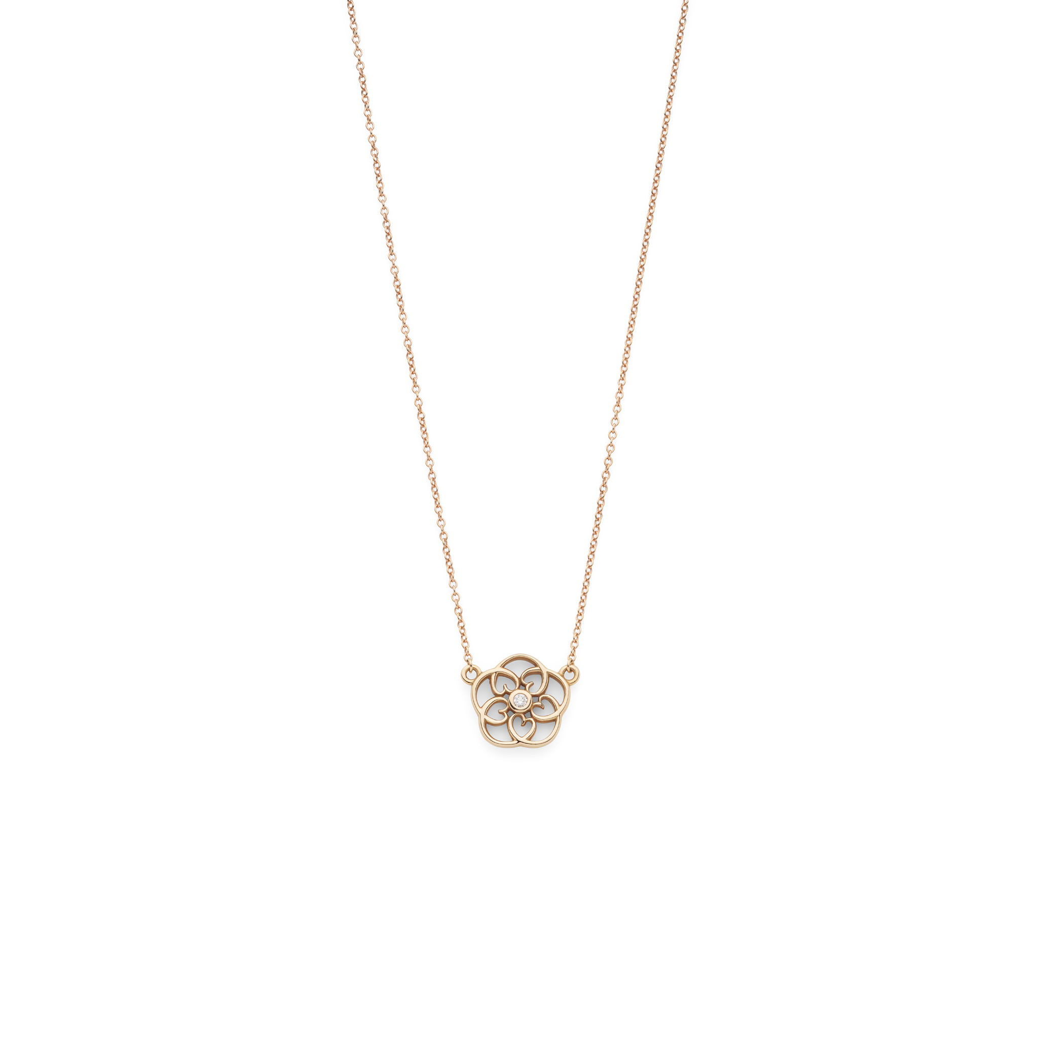 Of stylised floral design, collet-set with a central round brilliant-cut diamond, integral trace-link chain, singed, stamped Au750, UK hallmarks; with an original box and outer box