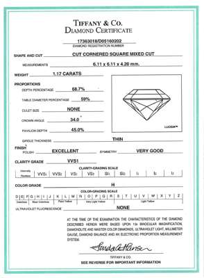 With accompanying Tiffany & Co Diamond Certificate, numbered 17363018/D05160202, stating that the diamond is VVS1 clarity, H colour, showing no fluorescence.