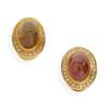 Each collet-set with a cabochon vari-coloured orangish-pink or greenish-orange sapphire, in a border of round brilliant-cut diamonds, post and butterfly fittings, stamped 750, with makers monogram