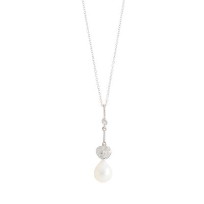 Collet-set with a round brilliant-cut diamond, the baton-link suspending a pavé-set diamond heart and a drop shaped cultured pearl, trace-link chain, unmarked