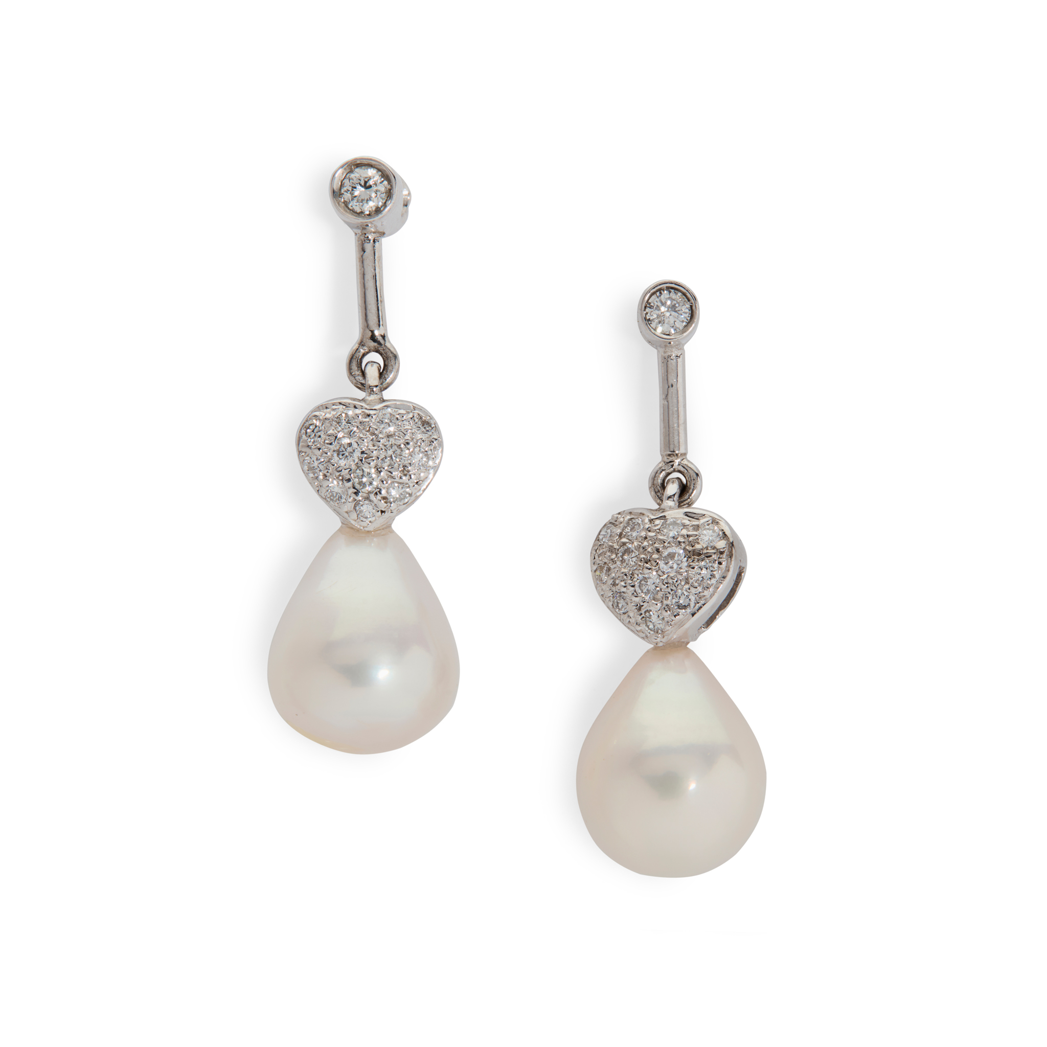 Each collet-set with a round brilliant-cut diamond, the baton-link suspending a pavé-set diamond heart and a drop shaped cultured pearl, post and butterfly fittings, unmarked