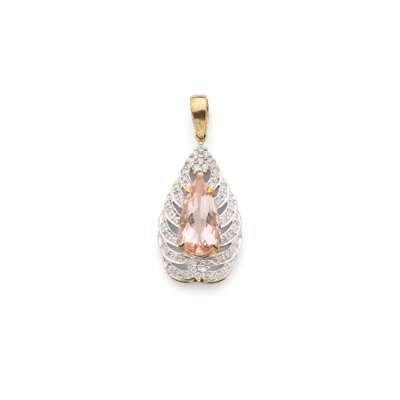 Claw-set with a pear-shaped morganite, in a pierced surround set with round brilliant-cut diamonds, plain bale, UK hallmark