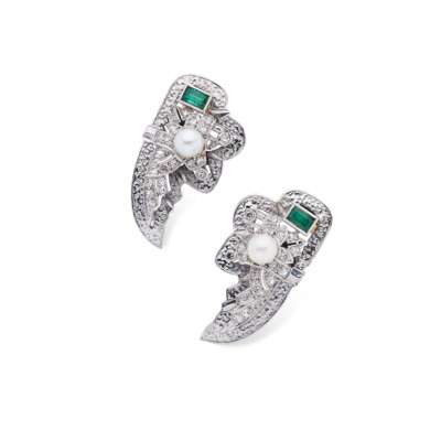 Each of stylised tapering design, collet-set with a rectangular step-cut emerald, a cultured pearl and eight-cut diamond detail, post and clip fittings, stamped 18ct