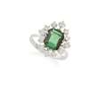 Claw-set with a cut-cornered rectangular-cut green tourmaline, in an open border of round brilliant-cut diamonds, plain band, stamped 750