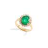 Claw-set with an oval-cut emerald, in a border of eighteen round brilliant-cut diamonds, plain band, stamped 750