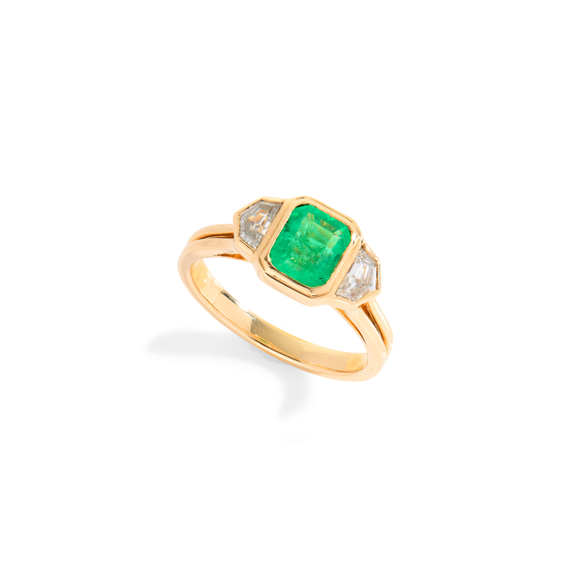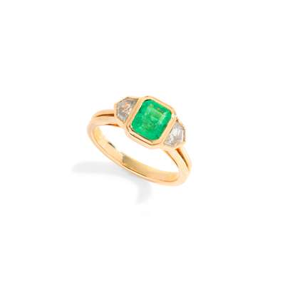Collet-set with a cut-cornered rectangular-cut emerald, each shoulder collet-set with pentagonal step-cut lab-grown diamond, plain band, unmarked