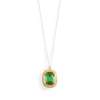 Collet-set with a cushion-cut green tourmaline, in a border of small round brilliant-cut diamonds, surmounted by a collet-set round brilliant-cut diamond, UK hallmark; trace-link chain, unmarked