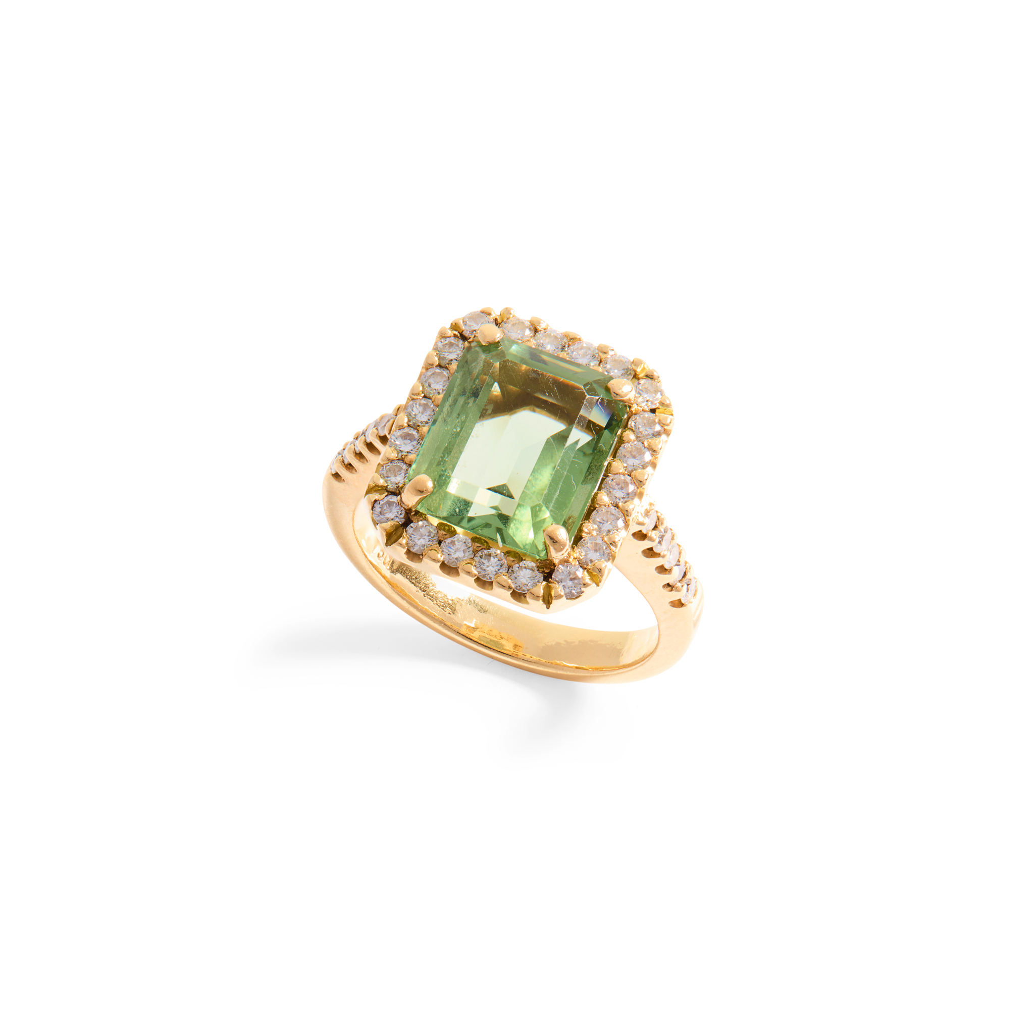 Claw-set with a rectangular step-cut peridot, in a border of round brilliant-cut diamonds, the shoulders similarly set, plain band, stamped 750