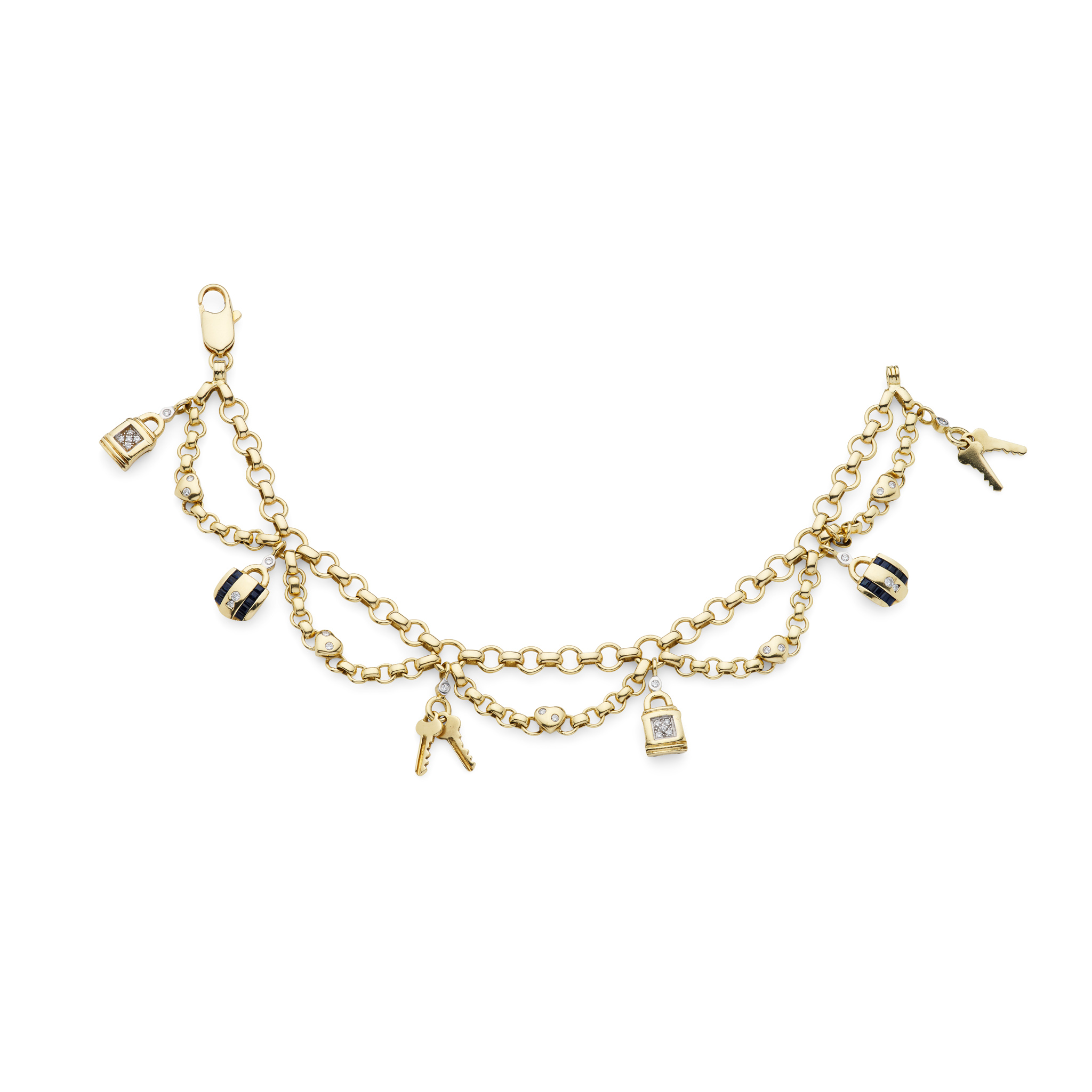Composed of circular-links, suspending a smaller circular-link swag details, and alternating pad-lock, handbag and key charms, set at intervals with small round brilliant-cut diamonds and calibré-cut sapphires, stamped 750