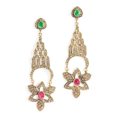 Each of tapering stylised design with pierced foliate detail, collet-set with a pear-shaped emerald and a cabochon ruby, rose-cut diamond detail throughout, post and butterfly fittings, unmarked