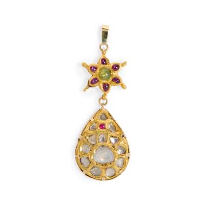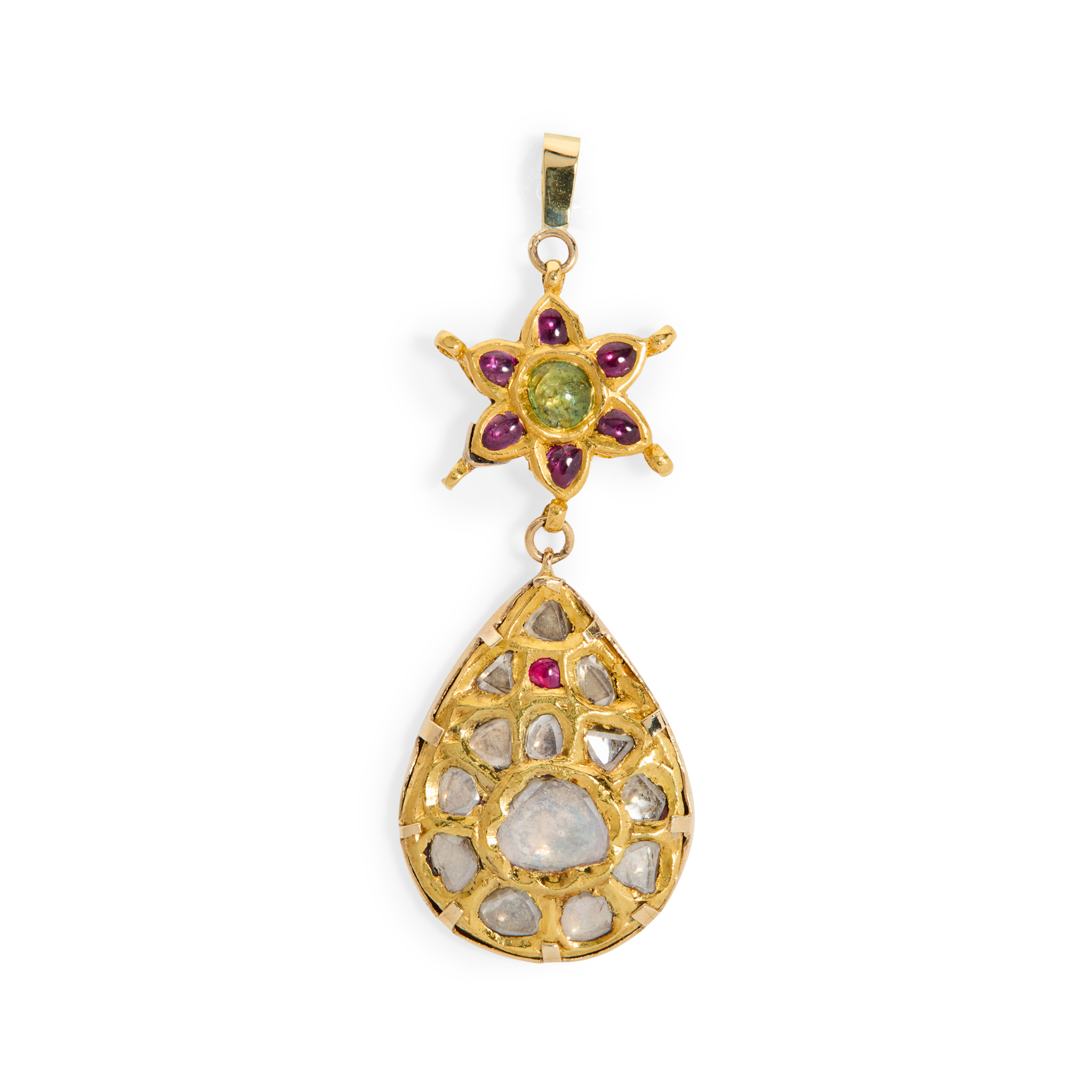 The floral cluster set with a cabochon green tourmaline and garnets, the drop-shaped pendant set throughout with polki diamonds, unmarked