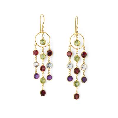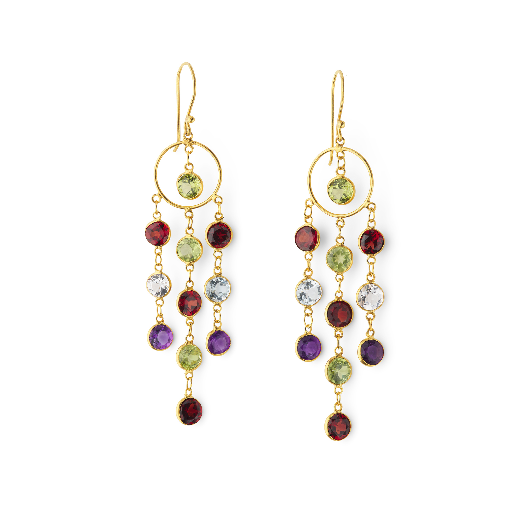 Each collet-set with a round-cut peridot in circular-link, suspending three rows of garnets, amethysts, peridots and quartz etc., hook fittings, unmarked