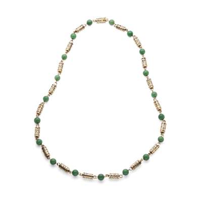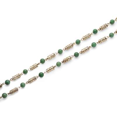 Set with nineteen aventurine quartz beads, between cylindrical links with pierced geometric and Chinese character detail, stamped 14k 585